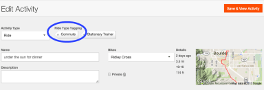 - Use previously recorded user patterns (or any rides under a certain distance) to auto-populate the commute checkbox post-ride. For instance, if I ride point-to-point and previously select a route as a commute, Strava could check the starting/ending locations compared to previous commutes and pre-mark the commute check-box.