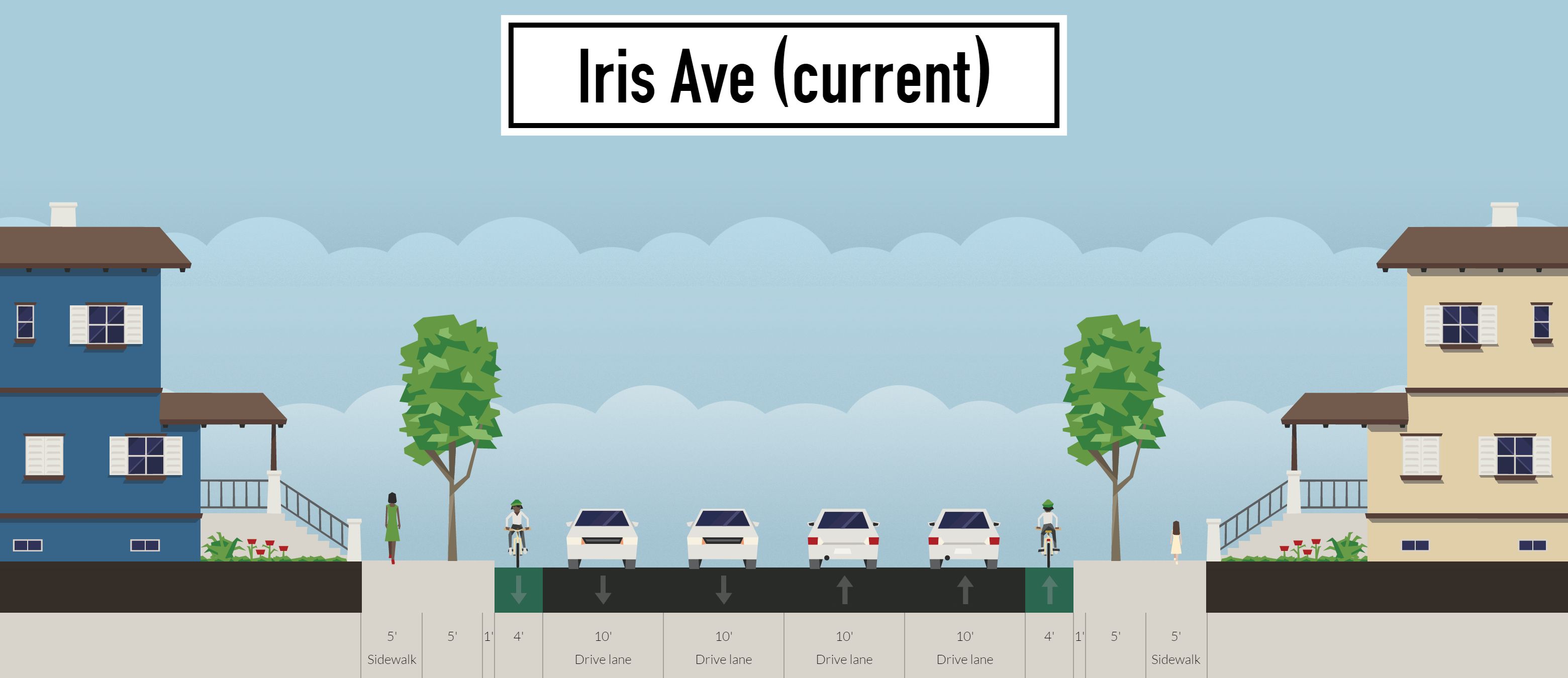 Iris is one of the few East/West bike corridors but it’s used significantly less by bikes than other thoroughfares in the city. A Strava heat map (based on recreational cyclists who use Strava) shows its use versus surrounding corridors: